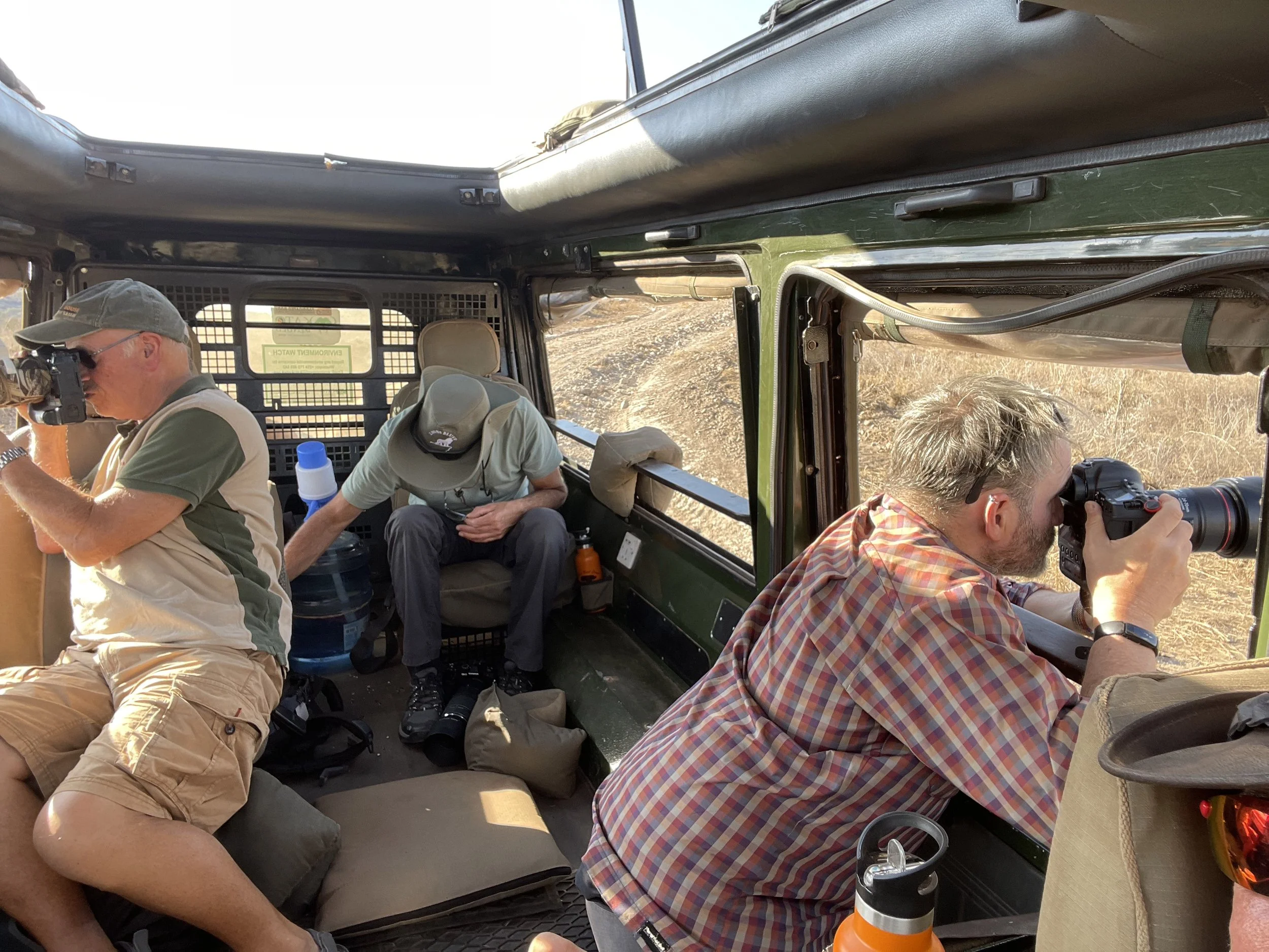 Now because of the habitat, and the way that leopards move, you cannot expect to sit in your seat and have a clear view. Sometimes it might be but there might be grass from where you are sitting, whereas for others it will be clear. The vehicle will always stop in the best place for the leopard and the sighting, it will be upto you to move in the vehicle to ensure a clear shot. Andy will be at the front controlling it for everyone BUT it's sometimes impossible to get a clear shot for everyone, whereas other times it's easy, so you have to understand that moving is essential. There is a low angle slot at the front that you will share between you.